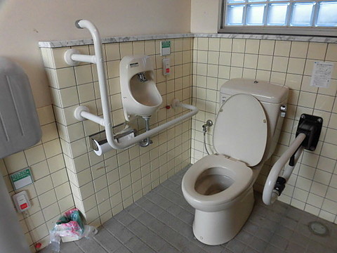 手すりの情報:着座して、右側に壁・L型手すり、左側に横棒縦スライド手すり