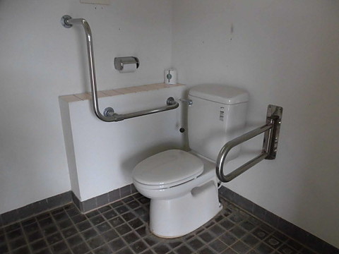 手すりの情報:着座して、右側に壁・L型手すり、左側に横棒横スライド手すり