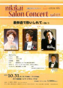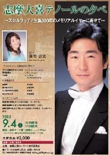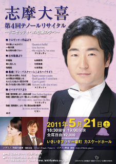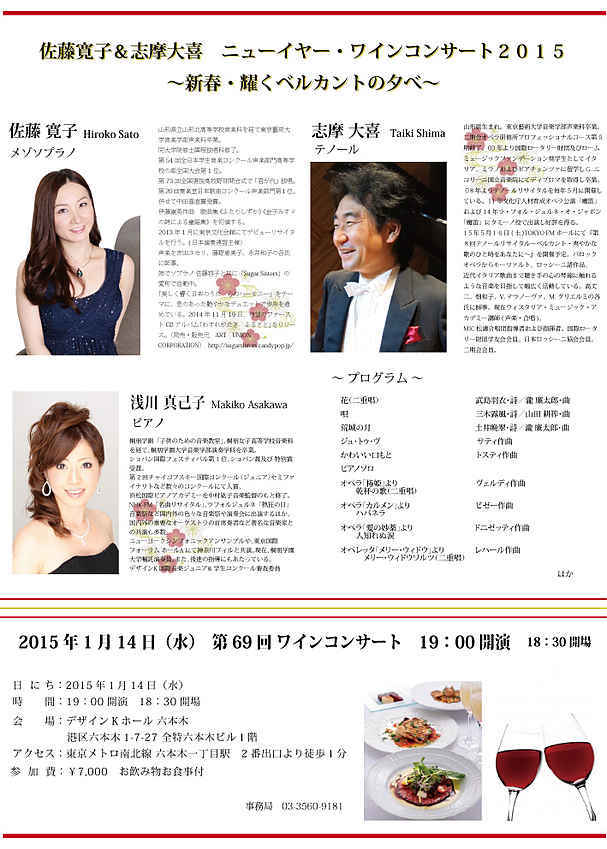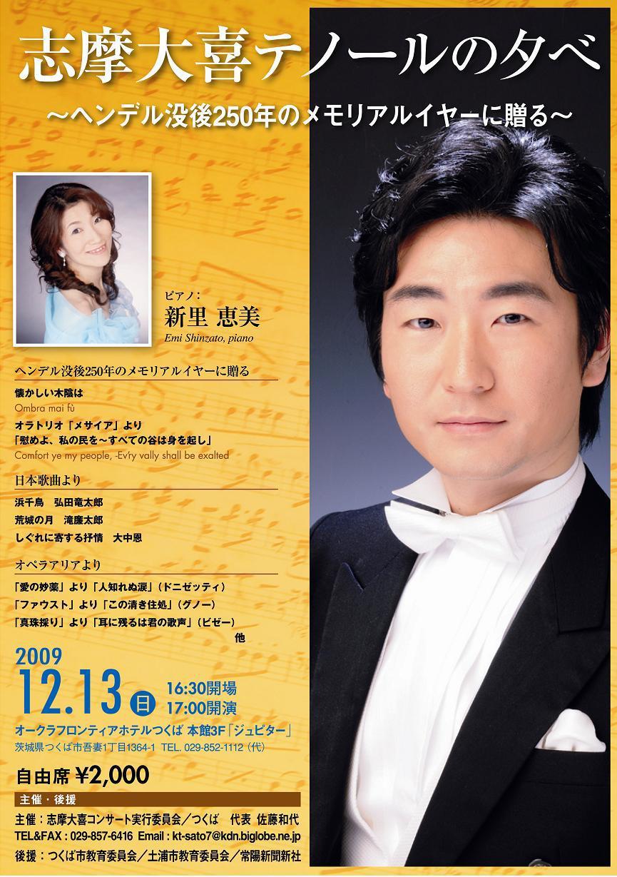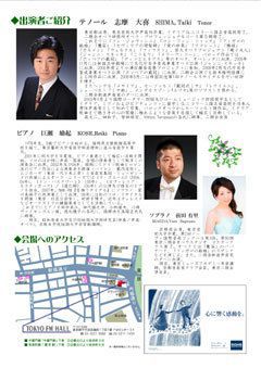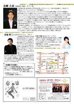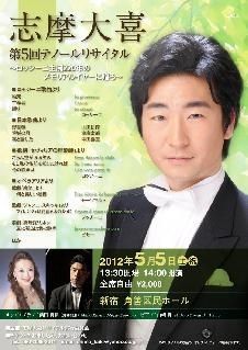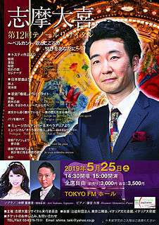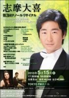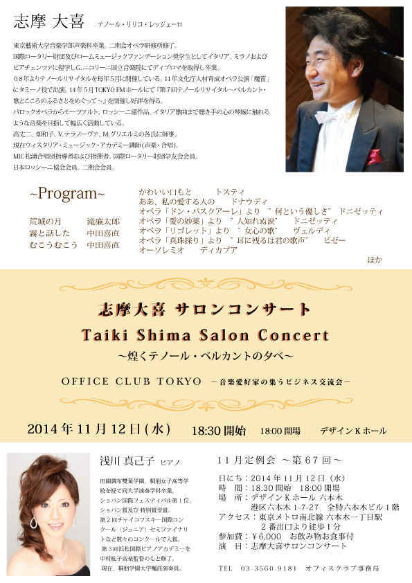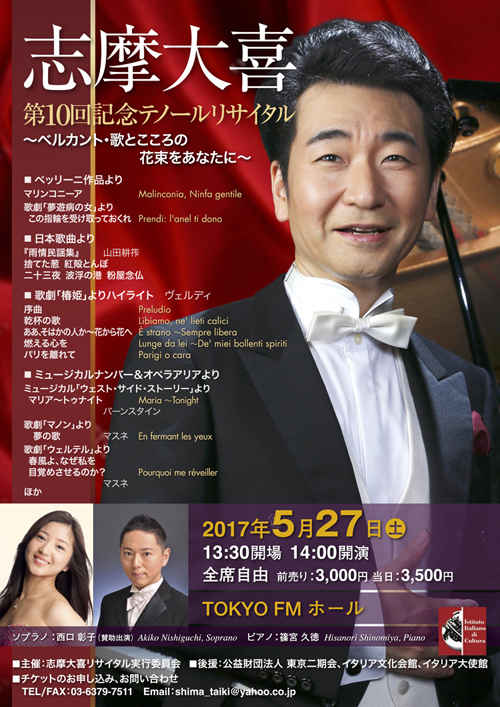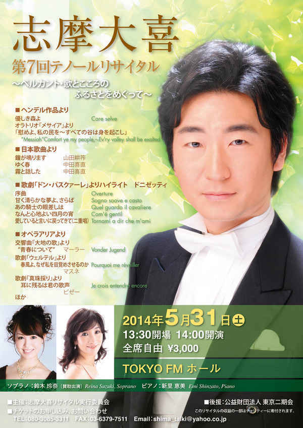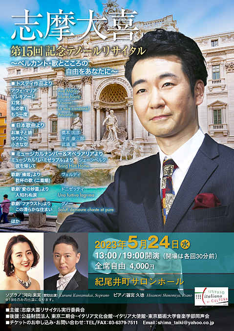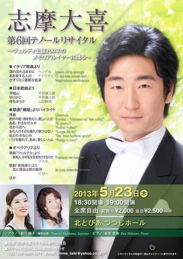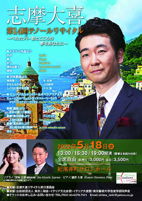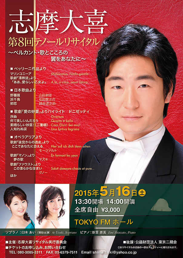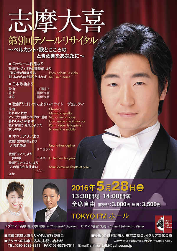 音楽活動 ![]() 「5月」 24(水) 13:00 /19:00 志摩大喜『第15回記念テノールリサイタル』 〜ベルカント・歌とこころの自由をあなたに〜 ソプラノ:河向来実 (賛助出演・19:00) ピアノ伴奏:篠宮久徳 紀尾井町サロンホール(麹町駅・永田町駅 徒歩5分) 全席自由 ¥4,000 主催:志摩大喜リサイタル実行委員会 後援:公益財団法人 東京二期会 イタリア大使館/イタリア文化会館/東京藝術大学音楽学部同声会 ![]() 「5月」 18(水) 13:00 /15:30 /19:00 志摩 大喜 『第14回テノールリサイタル』 〜ベルカント・歌とこころの夢をあなたに〜 今回のテーマは「長期化するコロナ禍からの メンタル解放・癒しのひととき」です。 ソプラノ:宮地 江奈 (賛助出演・19:00公演) ピアノ伴奏:篠宮 久徳 紀尾井町サロンホールホール (有楽町線 麹町・ 永田町駅より徒歩5分) 全席自由 前売り¥3,000 当日¥3,500 主催:志摩大喜リサイタル実行委員会 後援:公益財団法人 東京二期会 イタリア大使館/ イタリア文化会館/ 東京藝術大学音楽学部同声会 ![]() 25(土)15:00 志摩大喜 『第12回テノールリサイタル』 〜ベルカント・歌とこころの悦びををあなたに〜 第2部の『椿姫』ハイライト合唱で1月にフランス・ナントでご一緒した丸の内フェスティバルシンガーズの皆さまが特別出演します。 ソプラノ:中野亜維里(賛助出演) ピアノ伴奏:篠宮久徳 合唱:丸の内フェスティバルシンガーズ TOKYO FMホール(半蔵門駅徒歩5分) 全席自由 前売り¥3,000 当日¥3,500 主催:志摩大喜リサイタル実行委員会 後援:公益財団法人 東京二期会 イタリア大使館/イタリア文化会館/東京藝術大学音楽学部同声会 ![]() 5月26日(土) 14:00 志摩大喜 『第11回テノールリサイタル』 〜ベルカント・歌とこころの輝きををあなたに〜 ソプラノ:小川栞奈(賛助出演) ピアノ伴奏:篠宮久徳 TOKYO FMホール(半蔵門駅徒歩5分) 全席自由 前売り¥3,000 当日¥3,500 主催:志摩大喜リサイタル実行委員会 後援:公益財団法人 東京二期会 イタリア大使館/イタリア文化会館/東京藝術大学音楽学部同声会 ![]() 5月27(土)14:00 志摩大喜 『第10回記念テノールリサイタル』 〜ベルカント・歌とこころの花束をあなたに〜 ソプラノ:西口彰子(賛助出演) ピアノ伴奏:篠宮久徳 TOKYO FMホール(半蔵門駅徒歩5分) 全席自由 前売り¥3,000 当日¥3,500 主催:志摩大喜リサイタル実行委員会 後援:公益財団法人 東京二期会 イタリア大使館/イタリア文化会館/東京藝術大学音楽学部同声会 ![]() 5月16日(土)14:00 志摩大喜『第9回テノールリサイタル〜歌とこころのときめきをあなたに〜』 ソプラノ:高橋維(賛助出演) ピアノ:篠宮久徳 TOKYO FMホール(半蔵門駅徒歩5分) 全席自由 前売り¥3,000 当日¥3,500 主催:志摩大喜リサイタル実行委員会 後援:公益財団法人 東京二期会、イタリア大使館、イタリア文化会館 ![]() 5月16(土)14:00 志摩大喜 『第8回テノールリサイタル』 〜ベルカント・歌とこころの翼をあなたに〜 Sop:臼木あい(賛助出演) Pf:新里恵美 TOKYO FMホール(半蔵門駅徒歩5分) 全席自由 ¥3,000 主催:志摩大喜リサイタル実行委員会 後援:公益財団法人 東京二期会 イタリア文化会館 ![]() 14(水)19:00 『デザインKサロン・ニューイヤー・ワインコンサート2015 〜新春!耀くベルカントの夕べ〜』 M.Sop:佐藤寛子 Ten:志摩大喜 Pf:浅川真己子 デザインKホール・六本木 (東京メトロ南北線 六本木一丁目駅2番出口より徒歩1分) ¥7.000 (お食事・ワイン・ドリンク込み) 主催:デザインKコンサート・デザインK国際音楽コンクール 姉妹デュオ・シュガーシスターズでも活躍中のメゾ・ソプラノ佐藤寛子さんと新春ジョイントコンサート♪ ![]() 「11月」 12(水)18:30 『デザインK・オフィスクラブコンサート 〜煌くテノール・ベルカントの夕べ〜』 Ten:志摩大喜 Pf:浅川真己子 デザインKホール六本木 (東京メトロ南北線 六本木一丁目駅2番出口より徒歩1分) ¥6.000 (お食事・ワイン・ドリンク込み) 主催:デザインKコンサート・デザインK国際音楽コンクール ![]() 31(土)14:00 志摩大喜『第7回テノールリサイタル』〜ベルカント・歌と心のふるさとをめぐって〜 ソプラノ:鈴木玲奈(賛助出演) ピアノ伴奏:新里恵美 歌劇「ドン・パスクァーレ」よりハイライトほか TOKYO FMホール(半蔵門駅徒歩5分) 全席自由 ¥3,000 主催:志摩大喜リサイタル実行委員会 後援:公益財団法人 東京二期会 ![]() 3(土・祝) ラ・フォル・ジュルネ・オ・ジャポン「熱狂の日」音楽祭2014 モーツァルト『魔笛』ハイライト 東京国際フォーラム/東京・丸の内エリア ザラストロ:清水 那由太 夜の女王:川越 塔子 タミーノ:志摩 大喜 パミーナ:川上 茉梨絵 パパゲーノ:奥村 泰憲 パパゲーナ:浪川 佳代 ナレーション:向坂 真弓 指揮:岸本 祐有乃 管弦楽:市川交響楽団 合唱:丸の内フェスティバルシンガーズ ![]() 31日(木)19:00二期会サロンコンサート Vol.172 表参道で酔いしれて・・・(ね) ソプラノ 大塚幸子 テノール 志摩大喜 バス 鹿野由之 ピアノ 御邊典一 カワイ表参道 コンサートサロン パウゼ 全席自由\3,500(1ドリンク付き) Sold out 主催:公益財団法人 東京二期会 ![]() 6(日)14:00 世田谷区民合唱団