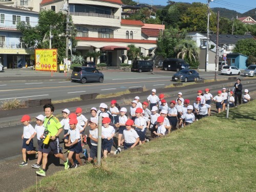 中央芝生で準備体操をし、コースの説明の後、全員で北側に向かって走り出し、大型車駐車場から周回通路を南進し、芝生広場に戻るというコース。
